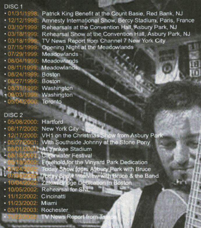 BRUCE SPRINGSTEENの1998年から2003年までの歴史を、海外PVやライブ映像等でとりまとめた作品で、他ではなかなかお目にかかれない映像なども含めて盛りだくさんの内容です。
